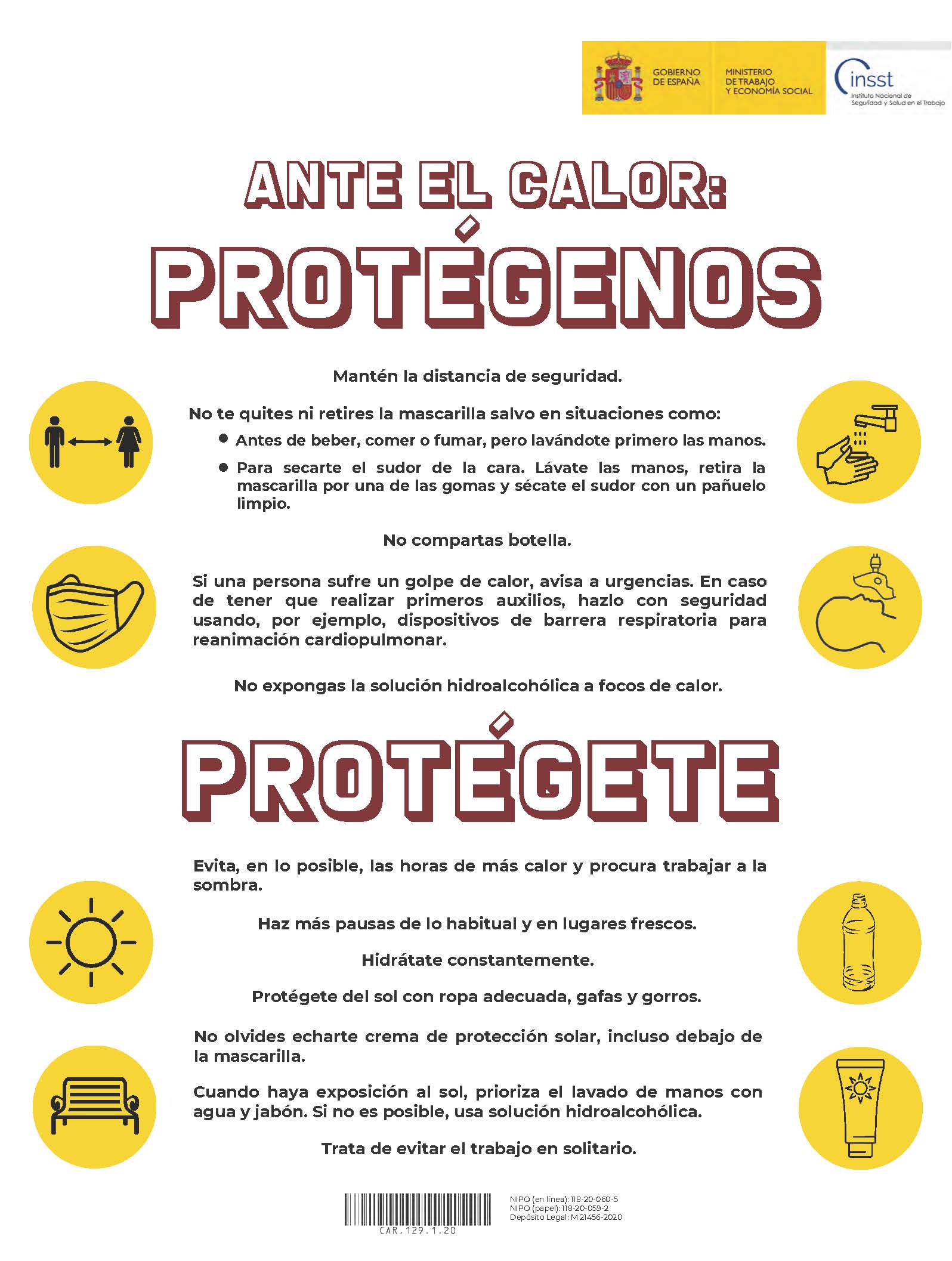 Dentro de la campaña “Ante el calor: protégenos, protégete”, el INSST ha preparado material divulgativo al respecto, entre el que se encuentra el citado cartel, “Ante el calor: pequeños gestos, grandes resultados”. Este cartel se puede descargar pinchando aquí.