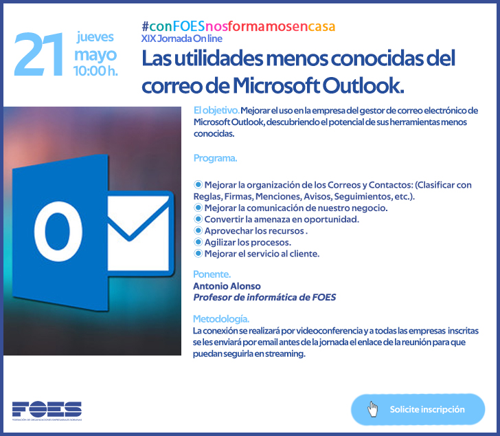 Mejorar el uso en la empresa del gestor de correo electrónico de Microsoft Outlook, descubriendo el potencial de sus herramientas menos conocidas es el objetivo de una nueva jornada gratuita de la Federación de Organizaciones Empresariales Sorianas (FOES).