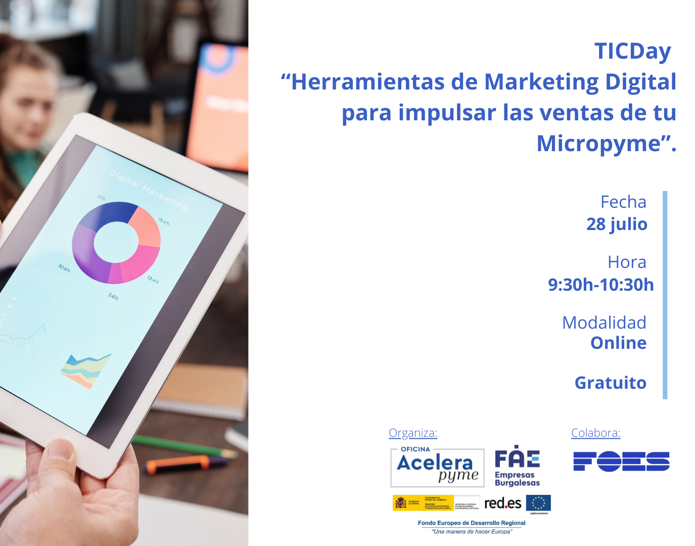 El webinar online gratuito TICDay “Herramientas de Marketing Digital para impulsar las ventas de tu Micropyme” se celebra mañana, 28 de julio de 9.30 a 10.30 horas. Los interesados deberán inscribirse en la web de FOES (www.foes.es).