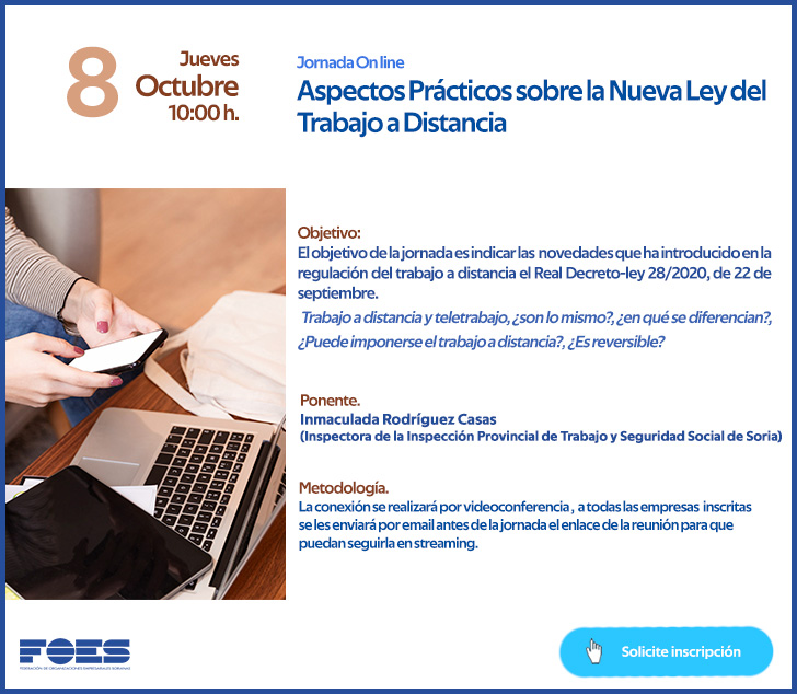 La jornada ‘Aspectos prácticos sobre la nueva Ley del Trabajo a Distancia’ se celebra el jueves 8 de octubre a las 10 horas por videoconferencia. Las inscripciones pueden realizarse a través de la página web de FOES (www.foes.es); los participantes recibirán por email un enlace de la reunión para poder seguirla vía streaming.