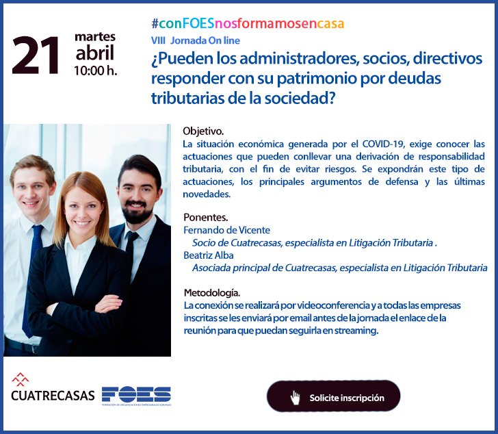¿Pueden los administradores, socios, directivos, responder con su patrimonio por deudas tributarias de la sociedad? Es la pregunta con la que los expertos arrancarán esta nueva jornada gratuita organizada por la Federación de Organizaciones Empresariales Sorianas (FOES).