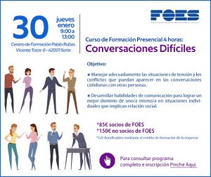 El curso ‘Conversaciones difíciles’ se impartirá el jueves, 30 de enero, de 9 a 13 horas en el centro de formación Pablo Rubio de la Federación de Organizaciones Empresariales Sorianas (FOES).
