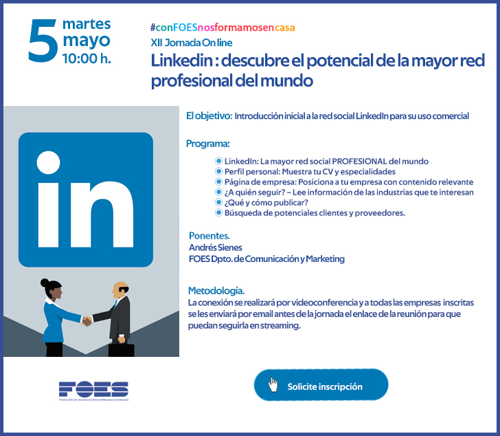 ‘LinkedIn: descubre el potencial de la mayor red profesional del mundo’ es la XII jornada gratuita organizada por FOES desde la declaración del estado de alarma con la que la Federación de Organizaciones Empresariales Sorianas (FOES) quiere ayudar a las empresas a descubrir las ventajas de esta importante red que acumula más de 300 millones de usuarios en todo el mundo.