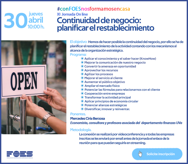 La jornada ‘Cómo dar continuidad al negocio y planificar el restablecimiento de la actividad’ se celebrará, vía streaming, el jueves día 30 de abril a las 10 horas. Lasinscripciones pueden realizarse a través de la web www.foes.es y los participantes recibirán en su mail un enlace antes del inicio de la sesión a través del que podrán seguirla.