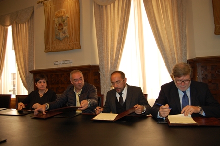 El Presidente de FOES, Santiago Aparicio, la Secretaria Provincial de CCOO en Soria, Ana Romero, el Vicesecretario general de UGT en Castilla y León, Evelio Angulo y el Presidente de la Diputación de Soria, Luis Rey, rubricaron ayer el Acuerdo para la constitución del Consejo del Diálogo Social cuyo objetivo prioritario es el desarrollo del Plan de Dinamización de Soria.