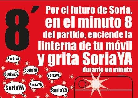 Por el futuro de Soria en el minuto 8 del partido enciende la linterna de tu móvil y grita Soria YA durante un minuto. Estés donde estés, bien en el propio Campo de Los Pajaritos o en cualquier otro lugar que te encuentres, a las 21.08 horas enciende la linterna de tu móvil y grita sucesivamente sin parar durante 1 minuto Soria YA.
